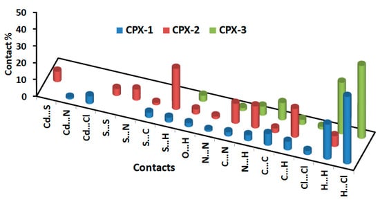 Summary of the intermolecular interactions and their percentages in the crystal structure of the studied Cd(II) complexes. Contacts with percentages less than 1% were omitted from this illustration for more clarity.