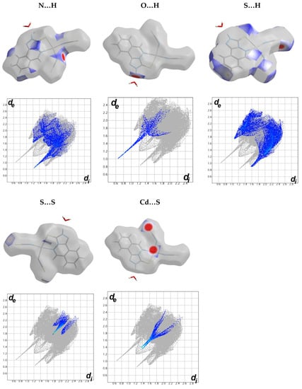Hirshfeld surfaces mapped over dnorm, shape index (SI) and curvedness for the studied Cd(II) complexes are shown in Figure S8 (Supplementary data). Summary of the most important contacts and their percentages are shown in Figure 11. It is clear that the H…H interactions are common in all complexes where the percentages of these interactions comprised 20.9, 6.4 and 30.7% from the whole interactions occurred in complexes 1–3, respectively. The shortest H…H contacts are 2.220 Å (H1…H12), 2.424 Å (H11…H11) and 1.891 Å (H7…H5A), respectively. The H…H interactions are the strongest in complex 3, as clearly indicated from the decomposed fingerprint plot and dnorm map of this compound (Figure 12, Figure 13 and Figure 14).