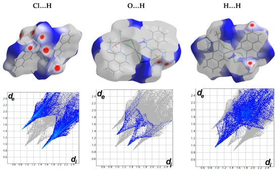 The decomposed fingerprint plots (lower) and dnorm maps (upper) of the most important contacts in complex 1.