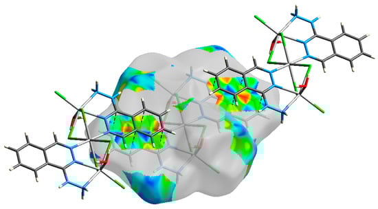 Another interesting feature of molecular packing is clearly seen from the shape index map, which is the presence of complementary red/blue triangles corresponding to the π-π stacking interactions between the almost parallel stacked phthalazine rings with relatively longer C…C contacts compared to complex 2 (Figure 16). The shortest C…C contact distances range from 3.452 to 3.547 Å, corresponding to the C5…C9 contacts.