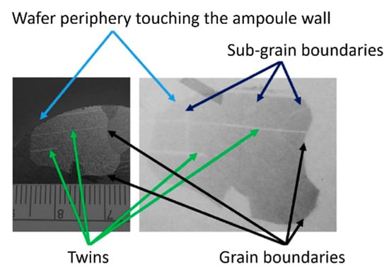Optical photograph of grain boundaries observed in a typical THM grown CZTS crystal (left) and the corresponding X-ray topographic image (Adapted from Roy et al. Sci. Rep. 2019, 9, 1620. Copyright 2019 Nature Research under Creative Commons Attribution 4.0 International License.]).