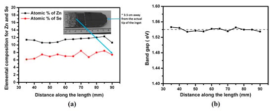 Variation of concentration (at%) of Se and Zn, (a) and bandgap (b) along the ingot axis of a THM grown Cd0.9Zn0.1Te0.97Se0.02 crystal (Adapted from ref. [42] Copyright 2019 Nature Research under Creative Commons Attribution 4.0 International License).