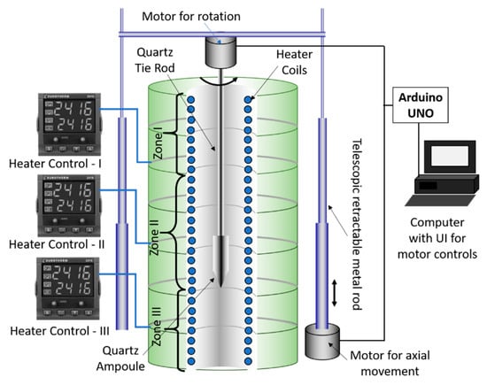 Chaudhuri et al. used a modified VBM at the University of South Carolina (UofSC), to grow CZTS single crystals [21]. They used 7N purity elemental precursors viz., Cd, Zn, Te, and Se rather than pre-synthesized precursors. The precursors were stoichiometrically weighed with 5% excess Te and were vacuum (10−6 Torr) sealed in a conically tipped quartz tube. Excess Te helps keep the growth temperature lower and may control certain intrinsic defect levels and defect complexes in CZT by causing favorable carrier compensation [48]. No compensating agents such as In were used. The polycrystalline material was synthesized at ~1085 °C in a three-zone tubular furnace. The schematic of the furnace for a typical VBM growth is shown in Figure 5. The three separate heater controllers were programmed to achieve an axial temperature gradient of 2.5 °C/cm. In a similar arrangement as mentioned for the THM process, the ampoule tied to a quartz rod was moved downward inside the furnace at a constant velocity of 2 mm/h using a computer-controlled motor. This vertical motion cycle was repeated three times for a typical growth run which is a common practice to enhance the homogeneity and crystal growth yield. The furnace was slowly cooled following the end of run to avoid any thermal stress. The ampoule was also constantly rotated using a separate computer-controlled motor at a rotational speed of 12 rpm to maintain a uniform radial temperature distribution.