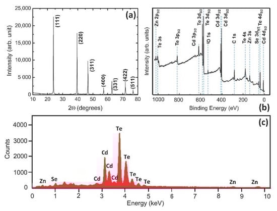 Powder X-ray diffractogram (a) survey scan using XPS (b) and EDX scan. (Adapted with permission from ref. [49]. Copyright 2021, IEEE) (c) of Cd0.9Zn0.1Te0.97Se0.03 grown using a VBM growth at UofSC.