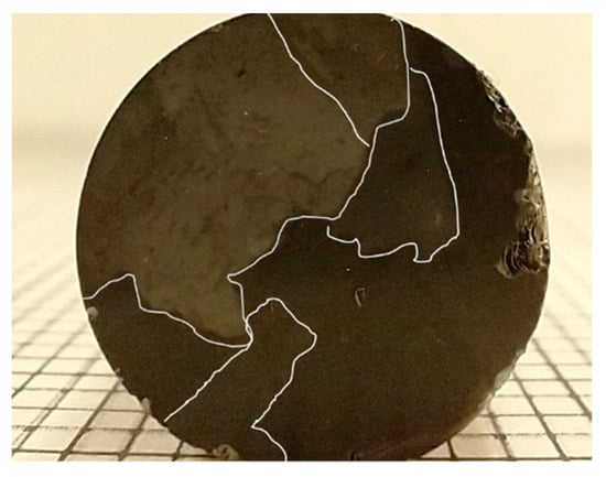 Cross-sectional view of a Cd0.9Zn0.1Te0.97Se0.02 ingot grown using a VBM method at UofSC. The grain boundaries have been emphasized with white lines for ease of visualization.