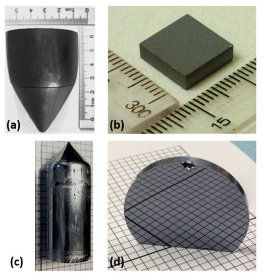 The grown ingots normally contain patches of single crystal regions called grains as shown in Figure 7. For detector fabrication, the wafers are visually inspected to identify the bigger grains which were cut out carefully in the form of blocks using diamond impregnated wire saws. The bigger the grain sizes are, the bigger the detector blocks could be harvested. Figure 8 shows the photographs of 2-inch diameter CZTS ingots grown using a VBM and THM method [49]. The photographs of the wafers cut out from the ingots are also shown in Figure 8. The CZTS substrates require smooth surfaces for metal deposition during detector fabrication. Any reminiscent wax used for attaching the ingots to the holders or crystal cutter chucks are cleaned using appropriate organic solvents. The wafers or blocks are first grounded and lapped mechanically starting with coarse sandpaper followed by finer grits down to 1500 grit SiC abrasive papers. The grounded wafers are then polished using an alumina powder-water slurry with grain sizes in the range 0.5 to 0.05 µm with various other sizes in between.