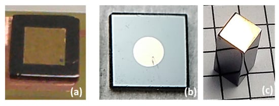 The Frisch collar configuration is also preferred for large volume detectors. To achieve a Frisch collar geometry a copper sheath is wound around the detector sides. The detector sides are lined with insulating Teflon tapes to isolate the detector body from the sheath to prevent flow of excess surface currents. The length of the sheath along the detector depth has to be optimized for the optimum detector performance. Roy et al. reported that a Frisch collar length of 3 mm yielded the optimum performance for a 6.65 mm thick CZTS detector [17]. The Frisch collar (Cu sheath) is generally grounded and is at equipotential with the cathode. In practice, the bias is applied to the anode in a Frisch collar detector which also acts as the detector window. The window metal contact is kept thin (<100 nm) to avoid energy loss of the incoming radiation, especially for charged particle detection. For achieving a guard ring structure, shadow masks do not suffice, and hence photolithography techniques are adopted. Figure 9 shows photographs of CZTS detectors in various detector configurations.