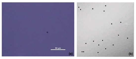 The wafers cut from the ingot go through some screening measurements prior to the actual detector fabrication. The bare crystals are first studied using infrared (IR) transmission imaging to detect the presence of secondary phase Te inclusions or precipitates. It is common to find unreacted Te aggregating sporadically within the crystal volume during the crystallization process resulting in Te inclusions. While CZTS is transparent to IR photons, due to the narrow bandgap (0.3 eV) of tellurium, Te tends to absorb the IR photons. IR transmission imaging thus results in a contrast image clearly showing the Te inclusions as darker spots. The IR transmission microscopy system uses a large field-of-view microscope objective, a CCD camera, a motorized X-Y-Z translation stages, and an IR light source coupled with a wide-beam condenser for illuminating the samples. The sizes and concentrations of Te inclusions were evaluated by taking images at several locations evenly distributed along the long side of the crystal from two perpendicular directions. Figure 10 shows the IR transmission images of VBM and THM grown crystals [49]. A 5× magnification corresponding to a depth of focus of 14 mm was used. Each scan generated several stacked images and covered an area of 1.1 × 1.5 mm2. From the IR micrographs, the Te inclusion concentrations were calculated to be 4.3 × 104 and 8 × 105 cm−3 for the THM and VBM crystals, respectively. It can be noticed that the concentration of the Te inclusions is an order of magnitude lower in the THM crystal compared to that of the VBM. The Te average inclusion sizes were measured to be about 8 µm. Te inclusions larger than 10 µm are known to be potential recombination centers in CZT detectors [51,52,53].