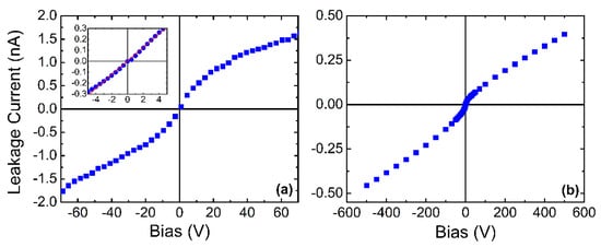 The crystals with a lower concentration of Te inclusions are then sorted for resistivity measurements. For these measurements, gold contacts are deposited on the two opposing faces meant to be the detector anode and cathode. The contacts generally cover the entire surface area barring the sides. An electric field is applied across the detector and the current flow across the thickness is measured using a sensitive current meter. The currents are on the order of sub-nA at electric fields on the order of 500 V/cm. Figure 11 shows the current-voltage characteristics typically observed in THM and VBM grown crystals. The bulk electrical resistivities were calculated to be on the order of 1010 Ω-cm. Such detectors are sorted for high resolution detector fabrication. Detectors that show resistivities below 109 Ω-cm are screened out. It can be noticed that the curves obtained in CZTS are not symmetric with respect to the bias polarity in general. This is mostly due to the different surface conditions at the two contact interfaces and is frequently observed in CZT detectors, as well [54,55]. Unlike CZT, reports on surface passivation to improve (lower) the surface conditions and leakage current is scarce. Egarievwe et al. reported an average improvement of 25% in the energy resolution measured for 59.6 keV gamma rays after passivating the CZTS surface with 10% aqueous solution of ammonium fluoride. However, they did not observe any noticeable improvement in the charge transport properties [25].