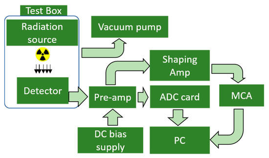 Schematics of a hybrid radiation spectrometer which can acquire analog PHS, as well as digital pulse shapes from a detector. The vacuum pump is used to evacuate the test box for alpha particle measurements.