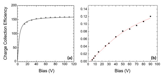 To determine the µτ product, PHSs are acquired as a function of bias voltages starting from as low a bias as possible. For monoenergetic alpha particle sources only one peak will be present in each PHS, as the source emits alpha particles with a single average energy of . The energy corresponding to peak position () is proportional to the output charge of the detector. The charge collection efficiency (η) is then calculated as the ratio and plotted as a function of the bias . The CCE vs. bias plot is fitted using a single-polarity Hecht equation given below as Equation (2) to determine the µτ product of a detector with thickness .