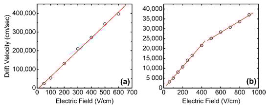 Variation of drift mobilities as a function of electric field measured for electrons (a) and holes (b) in a VBM grown Cd0.9Zn0.1Te0.97Se0.03 planar detector (Adapted with permission from ref. [21]. Copyright 2021, AIP Publishing). The solid lines are the straight line fit to obtain the mobilities. Note the two separate slopes in the mobility plot for holes.