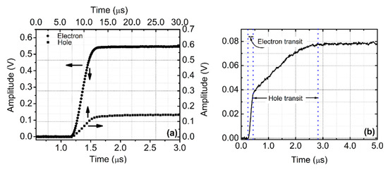 The drift mobility in semi-insulating thick crystals is usually measured using time-of-flight (TOF) techniques where an ionizing source is used to create charge pairs just beneath the detector (planar geometry) window surface. A bias is applied to collect the charge pairs. The electrons or holes drift across the detector. This transit creates a signal at the output of the charge (current) sensitive pre-amplifier whose risetime (width) gives the transit duration () when plotted against time. Assuming a linear distribution of electric field across the detector, the drift velocity of the charge carriers can be calculated as , being the detector thickness (therefore, it is necessary that the penetration depth of the ionizing radiation in the detector is negligible with respect to the detector thickness). To capture the charge (current) pulses, digital techniques are required to trace and store the pre-amplifier output digitally (Figure 12). Usually, a large number of such pulses are recorded for a particular bias and the average transit time is calculated. The experiment is repeated for several bias voltages and the drift-times are plotted against the corresponding electric field () calculated as (). A plot of as a function of is normally linear for moderate fields and a linear fit of the plot gives the drift mobility () assuming the linear relationship . More details on the digital spectrometer used to determine the drift mobility using the TOF method can be found elsewhere [9]. Chaudhuri et al. reported the calculation of hole drift mobility in CZTS for the first time using a TOF method [21].