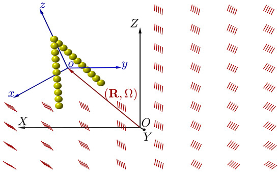 Sketch of the laboratory frame of reference and of the particle frame of reference . is the vector position of the center of mass of the particle in the laboratory frame, and is the set of Euler angles that rotate into . The red segments represent the director field with a splay distortion of wavenumber .