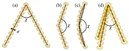 We model particles as rigid chains made up by tangent identical hard spheres of diameter . Beside V-shapes, some other particle geometries are examined for comparison (see Figure 2). In our calculations the unit vectors appearing in the definition of the ODF, Equation (5), are taken parallel to the sphere–sphere bonds and are placed in the middle of bonds. The hard-core interaction potential between pairs of particles labeled A and B is defined as