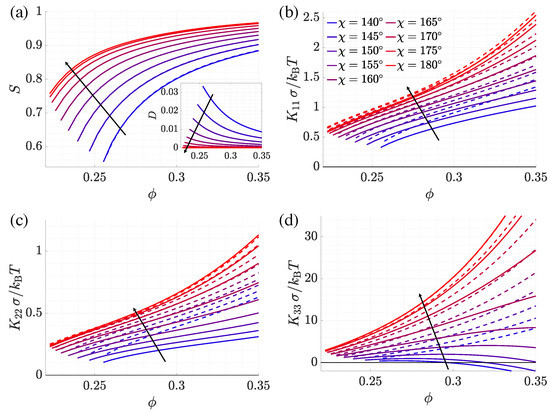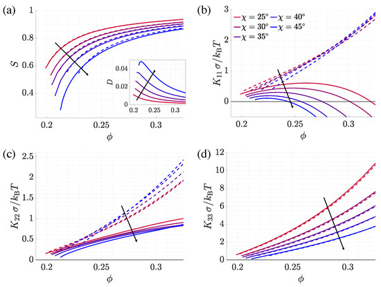 (a) Order parameters S and D (inset), and (b) splay, (c) twist and (d) bend elastic constant, as a function of the volume fraction . Values obtained using the non-local form of the ODF, Equation (5) (solid lines), and the local uniaxial form, Equation (6) (dashed lines), for the nematic phase of acute angle V-shaped particles with different values of the bend angle.