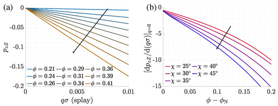 The induced polar order can be quantified by the order parameter defined in Equation (15). Figure 4a shows as a function of the deformation wavenumber q for V-shaped particles with bend angle at different values of the packing fraction. is equal to zero in the uniform nematic phase, but it then exhibits a linear increase (in absolute value) with the wavenumber q of the splay deformation. For a given splay deformation, takes a finite value at the isotropic-nematic transition and then increases upon moving to higher density. The slope of at , which can be seen as a kind of ’flexopolar’ coefficient [24], is a parameter that quantifies the capability of the material to acquire polar order in response to a splay deformation. Figure 4b shows the slope of at for V-shaped particles with different bend angles, as a function of the volume fraction, and we can see that this capability increases as the bend angle widens.