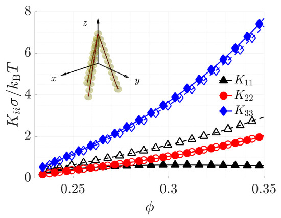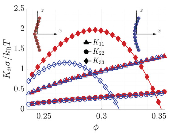 Elastic constants as a function of the volume fraction , for a nematic phase formed by obtuse angle V-shaped particles with a bend angle , red full symbols, and by the curved particles as shown in Figure 2c, blue empty symbols. (For the latter system, the scale is different from the one in Figure 1a of [37], since in that case, the volume fraction was calculated as .)