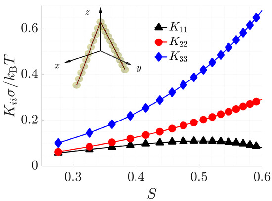 Finally, Figure 6 collects the three Frank elastic constants of particles with bend angle , which is close to the value of the apical angle in the molecules with 1,7-naphthalene central core investigated in Reference [36]. A strict comparison with experimental results is beyond the scope of this work, since the model used here (rigid particles interacting though a purely repulsive potential) lacks important elements for a proper description of thermotropic nematics made of flexible molecules. Nevertheless, it is interesting to see that for S around , which appears reasonable for thermotropic systems, the anomalous order is found, which is in line with the experimental trend reported in [36], and the relative values of the three elastic constants are also comparable to the measured quantities.