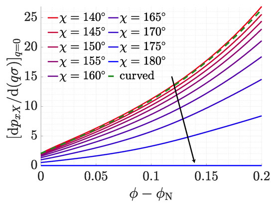 Figure 7b–d shows the elastic constants, and, as for the case of acute angle particles, we also report the results obtained using the local ODF form, Equation (6). Of course, the curves coincide for the rod-like particle, i.e., . As the bend angle narrows, the isotropic-nematic transition shifts to higher density, and the calculated elastic constants exhibit a continuous decrease from the values for a straight rod. Such effects are also predicted by the local ODF model; they can, at least partly, be ascribed to the lowering of the particle aspect ratio as the bend angle narrows. With decreasing , the differences between the predictions of the local and the non-local ODF model also increase. This can be related to the increase in particle biaxiality, which is naturally accounted for by Equation (5). However, this is not sufficient for the bend elastic constant, where a distinctive behavior appears when the non-local form of the ODF is used: below a certain bend angle, it exhibits a non-monotonic density dependence, analogous to that reported in the previous section for the splay elastic constant of acute angle V-shaped particles. The unconventional bend elasticity of bent particles with an obtuse angle was already investigated using different models [26,27,29], and there is agreement on its origin being related to the emergence of polar order. Unlike the case of acute angle particles, examined in the previous subsection, here, the polar order is transversal, being related to the non-equivalence of particle orientations with the apex pointing either towards the center of the bend deformation or in the opposite direction. A suitable quantity to describe this is the order parameter , defined in Equation (14). For the linear particle (), the order parameter is equal to zero, but for particles of symmetry (), it is found to increase linearly with the wavenumber q of the bend deformation upon moving away from the uniform nematic state, . Figure 8 shows the slope of at , and we can see that it increases with the narrowing of the bend angle, which means an increasing polar response to bend deformations. For a given bend angle, the slope of takes a finite value at the isotropic-nematic transition, and it is subsequently an increasing function of density, i.e., of orientational order.