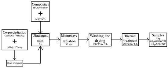 Diagram of the synthesis of HAp and HAp/OMWCNT and HAp/MWCNT composites.