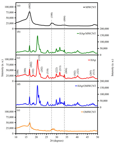 Diffraction patterns of the MWCNT (a), HAp/MWCNT (b), HAp (c), HAp/OMWCNT (d), and OMWCNT (e) samples. Vertical dashed lines indicate reflections associated with MWCNTs.
