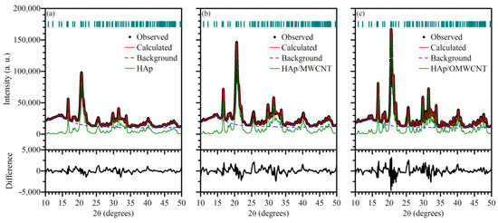 Rietveld refinement plot of HAp (a), HAp/MWCNT (b), HAp/OMWCNT (c).