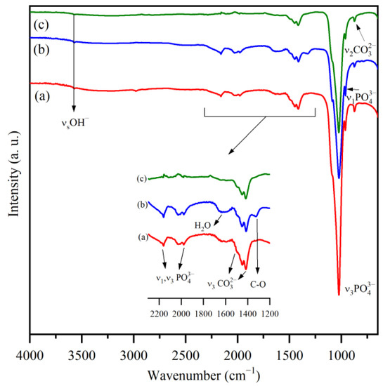 Figure 4 illustrates the characteristic vibrational modes of HAp identified and shown in the IR spectrum of each sample. Table 2 enlists the specific vibrational modes detected in each sample. The weak band at 3572 cm−1 was assigned to the OH− group. The vibrational modes related to PO43− ions were found at approximately 1000 cm−1, and their resonances were identified at the 1950–2200 cm−1 interval [39]. As shown in the inset in Figure 4, the band at 1630 cm−1 refers to adsorbed water [39,40], which appeared in both HAp and the HAp/OMWCNT samples. The band at 1325 cm−1 that appeared in the HAp/OMWCNT sample is associated with the interaction between the Ca2+ ion and the COO− group on the OMWCNT sample. According to [38], this band confirms the interaction between HAp and MWCNTs, which was corroborated by the XRD results. In addition, the band deconvolution approximately at 875 cm−1 showed a substitution of the OH− (870 cm−1 substitution type A) and PO43− (877 cm−1 substitution type B) ions for the CO32− ion. The contribution of these substitutions was observed at the 1410–1540 cm−1 interval [39,41]. Bands attributed to the substitution in HAp had 17.74 and 17.04 a.u. for substitution types A and B, respectively. Band areas decreased significantly in the composites. The HAp/MWCNT sample had 9.35 and 12.30 a.u., respectively, while the HAp/OMWCNT sample had 7.37 and 12.45 a.u., respectively.