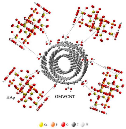 Figure 5 displays the probable interaction between HAp and OMWCNT. The FTIR results suggested that the Ca2+ ion from HAp is linked to the carboxylic groups from OMWCNT. Therefore, the nucleation centers promote the HAp growth on the surface of OWCNT. The HAp was modeled using VESTA software considering 100 atoms, while the OMWCNT was modeled with a Nanotube Modeler JCrystalSoft 1.8.0, and Spartan 1.1.4 using 676 atoms. The interaction of HAp and MWCNT could be explained by Van der Waals forces; however, theoretical studies are required to determine the bond energies.