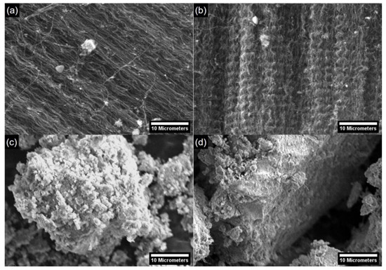 The surface morphologies of MWCNT, OMWCNT, HAp, and HAp/OMWCNT are shown in Figure 6. Figure 6a presents the aligned, straight, and smooth surface of the MWCNT in comparison to the aligned, straight, and wavy surface of the OMWCNT. These results suggest that the functionalization of nanotubes with carboxyl groups can modify the morphology. Figure 6c shows the semi-spherical shape of HAp due to the fast nucleation during synthesis. Figure 6d displays the HAp agglomerates formed by aggregation. The OMWCNTs are not visible because the HAp covers them.