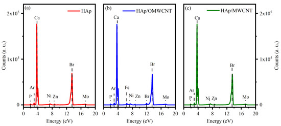 The compositional analysis by EDS showed that, as expected, all the samples contained Ca, P, and O, and only the composites contained C. This analysis also revealed that the HAp/OMWCNT sample had some impurities of Al and Si from cross-contamination, Fe traces from the MWCNT sample, and Br traces from the surfactant used in the synthesis; all are shown in Table 3. Then, a synchrotron XRF analysis detected several impurities of Ar, Ni, Zn, and Mo from cross-contamination in all the samples, because none of the reagents was composed of these elements. On the other hand, all the samples had Br residues from the surfactant, confirming that the HAp/OMWCNT sample also contained Fe, as shown in Figure 7a–c. Finally, the Al and Si content was discarded from the HAp/OMWCNT sample (detected by EDS), because these elements were not detected by the synchrotron XRF analysis, which is a very sensitive and reliable technique. Besides that, the amounts of these elements were outside the scope of consideration.
