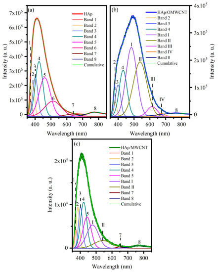 Figure 8a–c presents the photoluminescence spectra of the three samples and their corresponding deconvolution that shows each contribution in the luminescent process. Arabic numerals were used to label the HAp contribution bands, whereas those bands that belong to the MWCNT contribution were labeled with uppercase Roman numerals. The curves were deconvoluted using the Gaussian function in OriginPro 2019b software. The HAp and HAp/OMWCNT samples were adjusted to eight bands, while the HAp/MWCNT sample was adjusted to nine bands. Table 4 presents the exact position of each curve and the assignment to each contribution to explain their behavior.