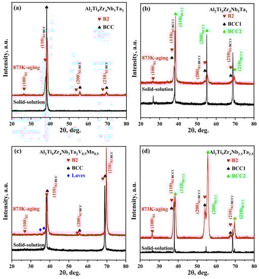 Figure 1 shows the XRD patterns of these four RHEAs in both solid-solutionized and 873 K-aged states, from which it is found that all these heat-treated alloys are mainly constituted of BCC and B2 phases. The B2 phase is characterized with a weak (100) diffraction peak (2θ~26°) in solid-solution state, and this peak becomes much more obvious after 873 K-aging for 24 h. Especially, there exist two kinds of BCC phases in S1 and S3 alloys, i.e., BCC1 and BCC2, as demonstrated by the diffraction peak splitting of the BCC phase. It is mainly ascribed to phase separation induced by a large composition difference. While the matrix of S0 and S2 RHEAs is constituted of one kind of BCC phase. The phase constitutions, lattice misfit (ε), particle size (r) of B2 and BCC phases in these RHEAs are presented in Table 1, in which the lattice misfits among B2, BCC1, and BCC2 phases in both solid-solutionized and 873 K-aged alloys are calculated by the equation of ε = 2 × (aB2 − aBCC) / (aB2 + aBCC). The lattice misfits of these RHEAs are in a range of 0.6~2.8%, which is crucial to the formation of BCC/B2 coherent microstructure. This will be discussed in next section.