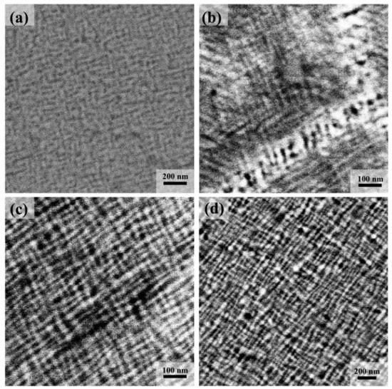 Moreover, the formation of spherical or cuboidal nanoprecipitates is controlled by the lattice misfit ε between the BCC and B2 phases [19]. In our previous work on Al-Ni-Co-Fe-Cr HEAs, we investigated the morphology evolution of precipitates with alloy compositions in the formula of Al2M14, in which M represents different combinations of transition metals of Ni, Co, Fe, and Cr in order to adjust the lattice misfit [20,21,22,23,24]. It was found that a small ε (ε < 0.7%) corresponds to spheroidal nanoprecipitates, a larger ε (ε > 2.0%) corresponds to a weave-like spinodal decomposition microstructure, and only a moderate ε (0.7% < ε < 2.0%) is contributed to the cuboidal nanoprecipitates [8,19]. Unfortunately, it is difficult to tune the lattice misfit into a moderate value due to a large composition difference in BCC and B2 phases. Thus, the weave-like spinodal decomposition microstructure is common in BCC/B2-based alloys, resulting in a serious brittleness [8,19]. Therefore, the present work will investigate the formation of BCC/B2 coherent microstructure in Al-Ti-Zr-Nb-Ta-Mo-V RHEA system with the composition formula of Al2M14, where M represents different combinations of Nb, Ta, Ti, Zr, V, and Mo. These alloys are specifically denoted as S0 (Al2Ti4Zr4Nb3Ta3), S1 (Al2Ti4Zr4Nb5Ta1), S2 (Al2Ti4Zr4Nb3Ta2V0.5Mo0.5), and S3 (Al2Ti5Zr4Nb2.5Ta2.5), respectively, as listed in Table 1. And the microstructural evolution of these alloys induced by different combinations of M will be discussed in the viewpoint of lattice misfit between the precipitates and matrix. The compressive mechanical properties of these RHEAs will also be measured.