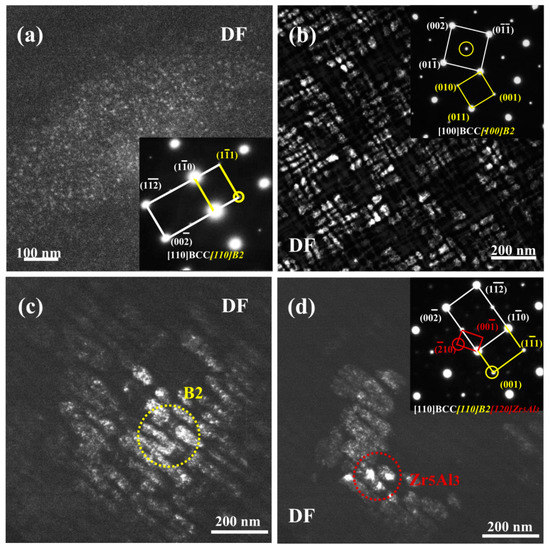 TEM characterization of S3 RHEA in solid-solutioned (a) and 873 K-aging (b–d) states. tEM dark field (DF) images (a) and corresponding SAED patterns along the [110]BCC axis; TEM dark field (DF) images (b) and corresponding SAED patterns along the [100]BCC axis; TEM dark field (DF) images (c,d) and corresponding SAED patterns along the [110]BCC axis for the corresponding SAED patterns.