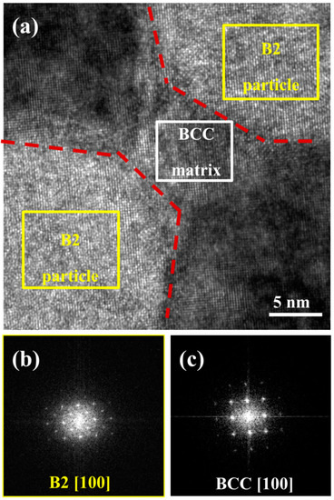 In order to further identify the crystalline structures of nanoprecipitates, the S3- Al2Ti5Zr4Nb2.5Ta2.5 alloy in both solid-solutionized and 873 K-aged states was analyzed by the TEM, as shown in Figure 3. In the solid-solutionized state, there exist spherical B2 nanoparticles with a size of 3~5 nm precipitated in the BCC matrix, which is identified with both the dark-field (DF) image and the corresponding selected area electron diffraction (SAED) pattern along the [110]BCC direction (Figure 3a). After aging at 873 K for 24 h, these B2 nanoparticles are gradually coarsened to the size of about 25~35 nm and exhibit a cuboidal shape, as shown in the TEM-DF image in Figure 3b. Moreover, another hexagonal Zr5Al3 phase co-precipitates with the B2, as demonstrated by the SAED pattern along the [110]BCC direction in Figure 3. The DF images for these two kinds of nanoprecipitates are shown in Figure 3c,d, respectively. As an equilibrium stable phase, Zr5Al3 phase has a D88-type M5Si3 structure, and has a similar composition with the metastable B2-ZrAl phase. Thus, Zr5Al3 phase could be transformed to the B2 phase under the combined effect of lattice collapse and chemical ordering of the {111} layer in the B2 phase [28]. In other words, both B2 and Zr5Al3 nanoprecipitates are co-exists in the BCC matrix. In order to reveal the interfacial coherency between BCC matrix and precipitates, the high-resolution TEM (HRTEM) image and fast Fourier transform (FFT) patterns along the [100]BCC direction shown in Figure 4a–c showing the interface of BCC and B2 precipitate (marked with a red dash line). It exhibits a perfect interfacial coherence between BCC and B2 phases, which could maintain the stable presence of B2 phase and inhibit the coarsening of B2 phase.
