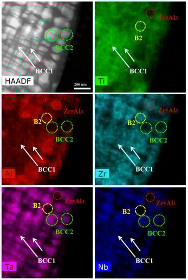 For investigating the relations among these four phases of BCC1, BCC2, B2 and Zr5Al3 of S3 RHEA at 873 K-aged state, the HAADF-STEM image and the corresponding elemental maps by the Super-X EDS are shown in Figure 5. Table 2 gives the element composition (at. %) of each phase of the 873 K-aged S3 RHEA. According to the XRD results, the aged S3 RHEA alloy exhibits two kinds of BCC phases, which is determined to be BCC1 and BCC2 phase, respectively. It is consistent with the SEM BSE results. It is obvious that the microstructures of these RHEAs are composed of the bright and dark regions due to the Z-contrast. Similarly, the HAADF-STEM in Figure 5 shows that the difference of Z-contrast. It is found that except for some precipitates, in the BCC-relevant regions the Ti element is distributed consistently. In the Ti-poor regions marked with red circles, these precipitates are mainly enriched in Al and Zr elements with an average composition of Al39.4Nb11.1Ta1.5Ti9.1Zr38.9 (at. %, in Table 2). In the regions marked with yellow circles, the nanoparticles are also primarily segregated by the Ti element, as well as Zr and Al, with an average composition of Al30.0Nb12.7Ta2.4Ti21.4Zr33.5 (at. %). Therefore, the former is identified as the Zr5Al3 phase and the latter is the B2 phase, respectively, since the differences between them are the segregation of Ti in B2 and the much more amount of Al in Zr5Al3. The regions marked with white rectangles in HAADF of Figure 5 are enriched by Ti and Zr, especially the Ti, where Ta, Al and Nb elements are depleted severely, determined to the BCC1 phase with the composition of Al5.4Nb9.1Ta2.2Ti53.0Zr30.3 (at. %). In addition, the bright regions marked with green circles are primarily segregated by Nb and Ta elements, which is consistent with the BCC2 particles in a cuboidal shape with the composition of Al7.9Nb26.0Ta22.6Ti33.4Zr10.1 (at. %).
