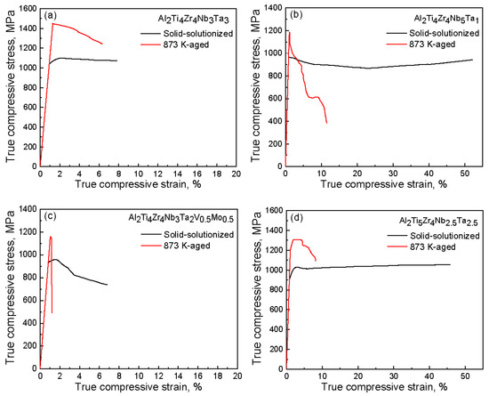 The room temperature compressive properties of the designed RHEAs in both solid-solutionized and 873 K-aged states were then performed. Figure 6 shows the true stress-strain curves, and the measured yield strength values of these RHEAs are listed in Table 1. The solid-solutionized RHEAs exhibit not only high yield strength (σYS = 920~1050 MPa), but also larger compressive plasticity over 15%, which is attributed to the ultra-fine spherical B2 nanoprecipitates embedded into the BCC matrix. After aging at 873 K for 24 h, the strength of aged RHEAs could be enhanced up to σYS = 1125~1400 MPa, which is comparable to that (σYS = 1125~1400 MPa) of the existing Al10Nb15Ta5Ti30Zr40 RHEA with similar heat treatments [32,33]. However, the plasticity of aged alloys is decreased down to below 10%, which might be related to the heterogeneity of microstructure, i.e., another kind of Zr5Al3 particles coexists with B2 and the BCC matrix separates into two phases after aging.