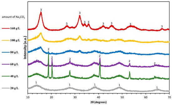 XRD graphs of precipitates of carbonation in sodium aluminate solutions of different starting concentration of Na2CO3 [carbonated at 40 °C, 160 mLn/min CO2 flow rate, 70 min carbonation time and 200 rpm stirring. Νο aging period]. 1—Boehmite [AlOOH], 2—Bayerite [Al(OH)3], 3—Dawsonite [NaAlCO3(OH)2].