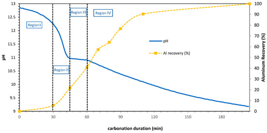In region I (30 min of carbonation), the system exhibits high buffering capacity, and the pH value gradually decreases. In this region, the free hydroxide ions concentration is high, and therefore, the acidity produced by the dissolved CO2 through Reactions (1) and (2) is consumed, slightly lowering the pH value of the solution. In region I, not enough mass of precipitate was obtained to perform XRD or FTIR analysis. In region II (30–45 min of carbonation), the solution buffer capacity is substantially lower, and therefore, the acidity produced by the added CO2 sharply decreases the solution pH. In this region, aluminum precipitation has already started, precipitating boehmite (22% recovery, at 45 min of carbonation). In region III (45–60 min of carbonation), the solution exhibits remarkably high buffering capacity again, which can be attributed to the massive aluminum precipitation, according to Reaction (4), that again liberates free hydroxide ions consuming the protons generated by the added CO2. In this region, aluminum is precipitated as boehmite again (41% recovery, at 60 min of carbonation). Finally, in region IV (>60 min of carbonation), the value of the pH is gradually decreased again until the end of precipitation. In general, aluminum recovery expressed as % of Al precipitated out of the solution, which increases as more carbon dioxide is added (Figure 3), showing a sigmoid curve with negligible aluminum precipitation in region I, very low in region II, low to medium in region III and medium to high in region IV.