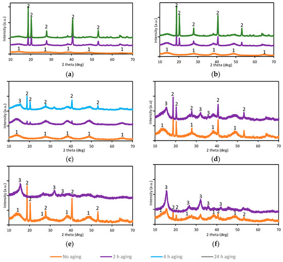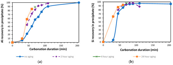 The tests conducted in Section 3.2 were reproduced, this time with the inclusion of aging as a parameter. Aging durations of 2, 4, and 24 h was tested. Upon completion of the carbonation process, CO2 gas purging stopped, and the pulp formed during precipitation was kept in agitation under temperature with predefined aging duration. At the end of the aging period, the precipitates were characterized with XRD, and the solution was analyzed for its Al and Si content. Al recoveries for different aging durations in the precipitate can be observed in Figure 5a, while the corresponding Si recoveries are observed in Figure 5b. Additionally, the XRD diffractograms are presented in Figure 6.