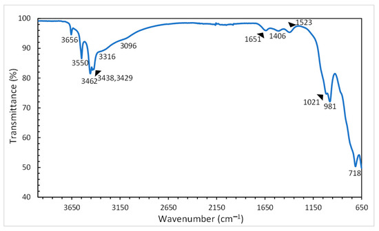 Furthermore, all precipitates were analyzed with FTIR spectroscopy. A typical graph of the precipitate obtained with an initial concentration of 20 g/L sodium carbonate, carbonation time of 60 min at 40 °C, 160 mLn/min CO2 flow rate, and 200 rpm stirring is shown in Figure 7 and the FTIR data in Table 2. It can be observed that the major phase is bayerite (identified in wavenumbers: 3656, 3550, 3462, 3438, 3429, 1021, 981 and 718 cm−1) along with boehmite (identified in wavenumbers: 3316 and 3096 cm−1) as a minor phase, as was expected from the XRD analysis. Apart from these phases, a phase termed aluminum hydroxide carbonate gel (identified in wavenumbers: 1523 and 1406 cm−1), which is an amorphous phase, was also present in the precipitate. According to the literature [29,30], aluminum hydroxide carbonate gel presence is usually accompanied by adsorbed water, which was also observed on the FTIR analysis. Gel formation could be a result of the rapid precipitation, as it is well known from the literature [31,32] that carbonates contribute to maintaining aluminum hydroxide gel in the amorphous form. When aluminum hydrolysis is performed in the presence of CO2, the resulting carbonates are specifically adsorbed on aluminum hydroxide gel, stabilizing it in the form of aluminum hydroxycarbonate gel (Reaction (5)) which retains its gelatinous nature even upon aging and does not contain other cations except those of aluminum [30].