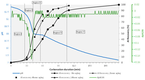 In summation, the aluminum recoveries, the pH values, and the time derivative of pH (, which denotes as ΔpH) are shown in Figure 9 and Table 3, where, based on the precipitating phases, now, five broad regions can be distinguished. Region I is where a sodium zeolite phase starts to precipitate with Al recovery up to 10%, while the derivative of pH ranges from 0.01 to −0.04, showing a slow decrease in pH. This is the region that relates to the neutralization of hydroxide ions. In region II, alumina hydrate phases start to precipitate with Al recovery up to 58%, along with a pH gradient as high as 0.15 and a decrease in pH. In this region, most of the hydroxide ions have been neutralized. Moving on, region III is where alumina hydrates are precipitated, with recovery up to 84% after aging (first boehmite is precipitated which transforms to bayerite during aging) and the ΔpH ranges from 0 to −0.01 showing an almost steady pH. In this region, the acidity produced by the addition of CO2 gas is neutralized by the alkalinity produced from the massive precipitation of aluminum. The following region, region IV, represents that stage of carbonation where metastable alumina hydrates are precipitated (first, boehmite is precipitated which is then transformed to bayerite during aging, and finally, a sufficient period of aging is induced) with a recovery of Al up to 94%. Finally, in region V, dawsonite is precipitated, initially reaching a recovery of Al up to 100%. In this region, the pH decreases with a ΔpH of −0.01 to −0.02 initially, and of 0 to −0.01 after 158 min.