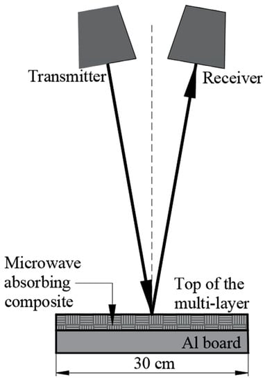 Based on the measurement methods for reflectivity of radar absorbing material (GJB 2038A-2011) [20], the AV3672C vector network analyzer (China Electronics Technology Group Corporation, Qingdao, China) was used to measure the absorbing performance of the material, with the test frequency band of X-band, of which the frequency ranged from 8.2 GHz to 12.4 GHz. The X-band belongs to the microwave part of the electromagnetic spectrum, and is one of the commonly used microwave absorption experimental bands. We tried to find some functional possibility in daily materials, especially nonwovens. The corresponding wavelengths of 8.2–12.4 GHz frequency range is 36.6–24.2 mm. If an absorber contains the depth of half wavelengths, it will fit with the conditions of destructive interference, which is beneficial to its absorption performance. However, it demands a large thickness. Therefore, we want to check whether or not multi-layer material has such an advantage at a small thickness of several millimeters. During the absorbing performance test, the sample size was set as 30 cm × 30 cm, and an Al board with the same size as that of the sample was used as a holder to reflect the transmitted wave back to the receiver, as shown in Figure 1.
