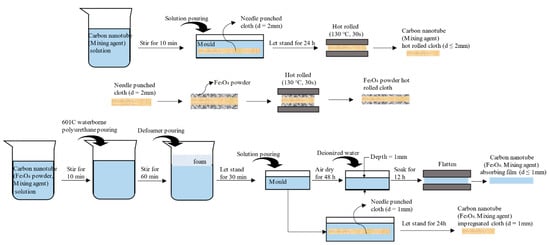 The raw materials used in the experiment included waterborne polyurethane, defoaming agent, dispersing agent, thickening agent, 1 mm polyester (PET) needle-punched cloth, 2 mm PET needle-punched cloth and deionized water. The absorbing agents used in the experiment included three types, namely carbon nanotubes (CNTs, tube diameter 40nm, tube length 5–10 μm), Fe3O4 powder (500 nm) and mixed reagent (CNTs and Fe3O4 powder are mixed at a ratio of 1:1).