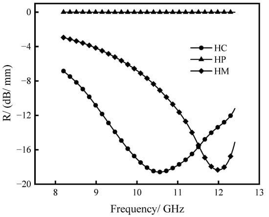 In general, when the reflection loss is less than −10 dB, it is considered as effective absorption. The efficient frequency is the frequency band with the reflection loss no higher than −10 dB, which means that more than 90% microwave can been absorbed. Therefore, it’s useful in judging the microwave absorption performance of an absorber. It can be seen from Figure 5 that the minimum reflection loss (−18.59 dB) of HC occurs at 10.55 GHz and the efficient frequency occurs at 8.86–12.40 GHz. The minimum reflection loss (−18.34 dB) of HM occurs at 12.00 GHz, and the efficient frequency occurs at 10.75–12.40 GHz. The HP has almost no absorbing effect. This paper considers that the attenuation of magnetic loss may have more of a relationship with thickness. After the hot-rolling process, the magnetic particles attached to the fiber surface only increase the chance of reflection and will not contribute to the absorbing property. However, in the situation of HC, it can achieve effective absorption in more than 3/4 of the X-band, as the chiral characteristics and spiral structure model of CNTs will absorb electromagnetic waves of this part of the frequency [24,25]. Moreover, the minimum reflection loss of HM occurs at higher frequency than that of HC. As the magnetic loss of ferrite disappears at several GHz, it is a dielectric loss material based on HM at the higher frequencies, displaying a narrow backward reflection loss, comparing with that of HC.