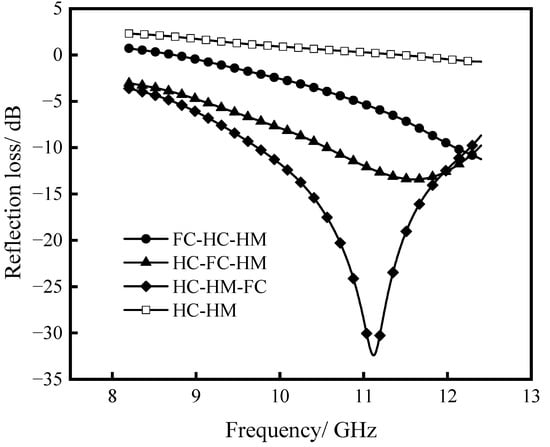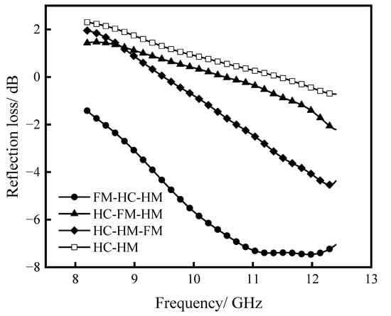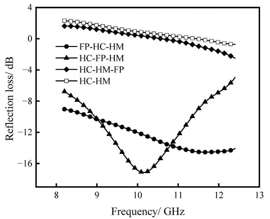 (4) For the multi-layer absorbing structure, HC–HM–FC has the best absorbing performance. The minimum reflection loss can reach −33 dB, and the effective absorbing frequency range covers about half of the X-band. When the FP film is placed between and on the HC and HM, the absorption performance is enhanced, and almost the entire X-band can have a reflection loss below −5 dB. When the FP film is placed on top of HC and HM, the absorption performance is improved. About half of the frequency range of the X-band can reach a reflection loss of less than −5 dB;