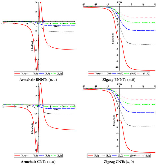 Here, the results outline whether the iron atom would be accepted into the interior of zigzag and armchair CNTs and BNNTs with different sizes. We calculate the total interaction energy between the Fe atom entering the tubes using Equation (2). Figure 2 shows that the Fe atom is accepted for all nanotubes with various radii (), where the interaction energies are less in the tube (positive K) than outside the tube (negative K). For the armchair ( Å), the Fe atom is prevented from entering both CNT and BNNT, as the energy in the positive K direction is bigger than the negative K direction, which is outside the tube. It can be seen from the plot that in this case the tube would not accept the iron atom from the rest because the suction energy is not sufficient to overcome the barrier energy at the tube opening. Thus, it is possible for the interaction energy E to exhibit two peaks (positive in the range and negative in the range ), as shown in Figure 2. We comment that when the curve of the energy E crosses the horizontal axis at , it becomes energetically favorable for the Fe atom to be inside the tube; thus, some additional energies are required to encapsulate the iron atom into the nanotube or tubes with smaller radii. In addition, by minimizing the energy, the results indicate that the Fe atom might be allowed to enter with a radius bigger than , such that zigzag nanotube.