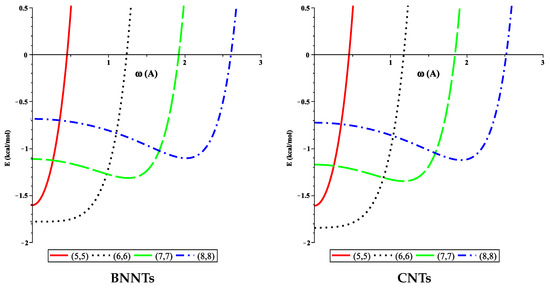 Herein, the preferred positions of a Fe atom inside armchair carbon and boron nitride nanotubes are determined by an evaluation of Equation (3). In Figure 3, we plot the relationship between the interaction energies E and the equilibrium distance for each tube; the results show that the lowest energy for the Fe interacted inside both CNTs and BNNTs is , where the Fe lies on the tube axis, which is the same location as for the tube. In addition, in the cases of and tubes, we obtain Å and Å, respectively. These results are equivalent to the distance between the tube wall and the Fe atom of approximately 3.5 Å, and 3.4 Å, respectively, so we can deduce that where the minimum energy is obtained, the location of the Fe atom tends to be closer to wall of the tube as the radius of the tube becomes larger. By summarizing our results, we may deduce that the optimal radius of both BNNTs and CNTs for encapsulating the Fe atom is ( Å), which provides the lowest interaction energies. Our results are in excellent agreement with those given in [12,15,17].