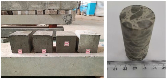 The base concrete was designed according to the strength grade C30, the cement was 42.5 ordinary silicate cement, the sand was made of machine-made sand, the coarse aggregate was made of crushed stone with the maximum particle size not exceeding 10 mm, the basalt fiber is 18 mm basalt fiber was produced by Shanxi Jintou Basalt Development Company, and the water was ordinary tap water. Based on the idea of the fiber volume rate method, the fibers were added directly to the specimens when they were made to the specifications of the design of the base concrete mix. The BFRC mixing is shown in Table 1. Each specimen group was dosed with basalt fiber as the variable, the dosage range was 0–6 kg/m3, and the unit variable was 3 kg/m3. The size of the specimen used in the uniaxial compression test was a cube with a diameter of 25 mm and a height of 50 mm. In the splitting tensile test, the specimen size was 100 mm cube. The specimens are shown in Figure 1.
